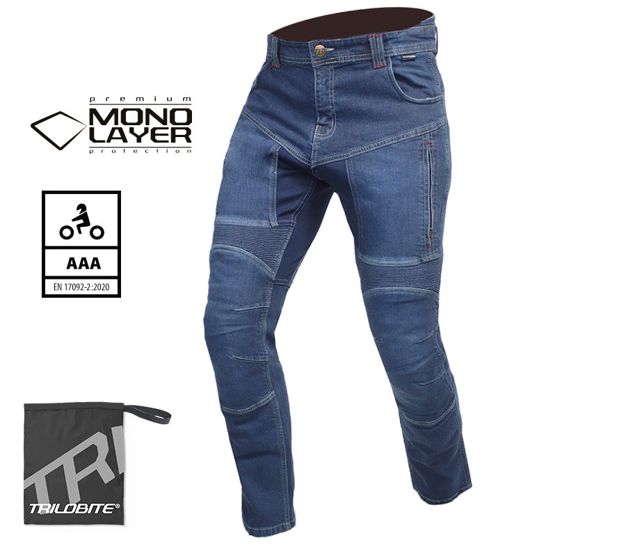 The iconic TRILOBITE® motorcycle jeans brand, the classic and universally loved Parado jeans have a new addition to the family. The new revolutionary TRILOBITE® Parado Monolayer motorcycle jeans, certified to AAA level, provide the ideal combination of comfort and protection. They are lightweight, breathable and have large ventilation pockets. This makes them perfect for riding on warm summer days. You won't find a separate aramid layer on them like their double-layered counterparts. In this case, the aramid is directly part of the knit along with other synthetic polymer fibers. This technological innovation, the TRI-STRETCHER® 5.0 denim look, has a unique design and construction developed in the TRILOBITE® workshop. It will guarantee you the highest level of comfort and safety available.